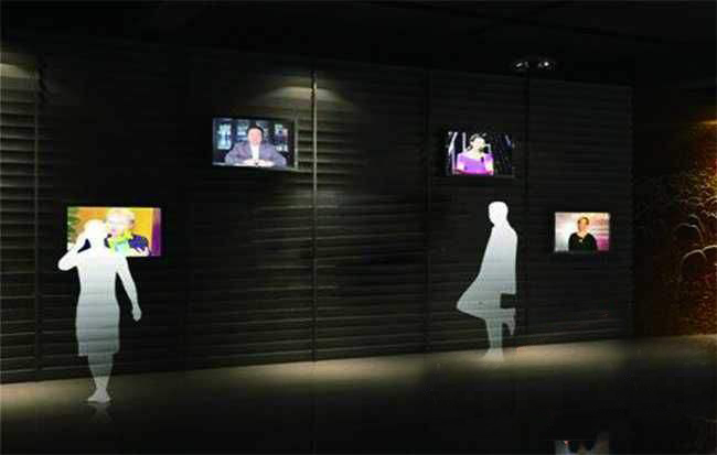 觀眾看到墻面上多個顯示設(shè)備中,每個顯示畫面中都有人物的視頻靜止影像。每臺電視下都有一個控制按鈕(可以是自動感應(yīng)器),當(dāng)觀眾按到其中一個時(當(dāng)自動感應(yīng)器撲捉有人接近 ……